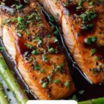 This Balsamic Glazed Salmon with Asparagus is a delicious and healthy sheet pan dinner featuring tender salmon fillets roasted alongside fresh asparagus, all coated in a sweet and tangy balsamic honey glaze. Perfect for a quick weeknight meal, the glaze adds a rich depth of flavor while the roasting method keeps the salmon juicy and the asparagus crisp-tender.