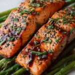 This Balsamic Glazed Salmon with Asparagus is a delicious and healthy sheet pan dinner featuring tender salmon fillets roasted alongside fresh asparagus, all coated in a sweet and tangy balsamic honey glaze. Perfect for a quick weeknight meal, the glaze adds a rich depth of flavor while the roasting method keeps the salmon juicy and the asparagus crisp-tender.
