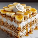 Once your Rice Krispies layer is cool and firm, it’s time to build those luscious layers. Spread the banana pudding mixture evenly across the crunchy base for a creamy layer that melts in your mouth. Then artfully arrange the sliced bananas across the pudding, adding bursts of natural sweetness and freshness with every bite. Top everything with a thick layer of whipped cream to create a dreamy, cloud-like finish.