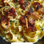 A creamy and flavorful Cajun Chicken Fettuccine Alfredo combining tender, spiced chicken with rich Parmesan cream sauce and perfectly cooked fettuccine pasta. This dish offers a spicy twist on the classic Alfredo, finished with optional fresh vegetables and herbs for added color and taste.