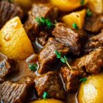 Return the browned beef to the pot along with the diced potatoes and dried thyme. Season with salt and black pepper, then pour in 2 cups of beef broth or water. Stir everything together and bring the mixture to a boil. Once boiling, reduce the heat to low, cover, and let it simmer gently for 1 to 1 1/2 hours. Stir occasionally and top up the broth if needed to keep a nice curry sauce consistency.