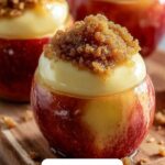 Lightly grease a baking dish with butter and place your apples upright inside. Fill each apple generously with the cheesecake mixture, packing it gently but firmly to the top and creating a small mound if possible. Optionally, sprinkle a little extra crushed graham crackers on top for a subtle crunch after baking. Bake at 350°F (175°C) for 25 to 30 minutes. You’ll know they’re done when the apples are tender but still hold their shape, and the filling looks set and creamy.