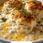 A comforting and cheesy chicken biscuit casserole that’s easy to prepare and perfect for a family dinner. Tender shredded chicken is combined with creamy soup, cheddar cheese, and refrigerated biscuits, baked to golden perfection with a buttery topping.