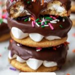 Delight in these easy-to-make Chocolate Peanut Butter Stacks—a creamy peanut butter and marshmallow filling sandwiched between crispy Ritz crackers, all coated in smooth melted chocolate and optionally decorated with festive sprinkles. Perfect as a sweet treat or holiday dessert!