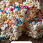 Funfetti Marshmallow Popcorn Treats are a colorful and delightful no-bake dessert combining crunchy popcorn with gooey melted marshmallows and festive rainbow sprinkles. Perfect as a birthday party snack or a sweet treat for any occasion.