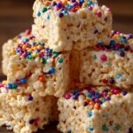 Funfetti Marshmallow Popcorn Treats are a colorful and delightful no-bake dessert combining crunchy popcorn with gooey melted marshmallows and festive rainbow sprinkles. Perfect as a birthday party snack or a sweet treat for any occasion.