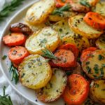 This Garlic Herb Roasted Potatoes, Carrots, and Zucchini recipe features tender, flavorful vegetables roasted to perfection with fresh thyme, rosemary, and garlic. A simple and healthy side dish bursting with savory herbs and a touch of olive oil, perfect for any meal.