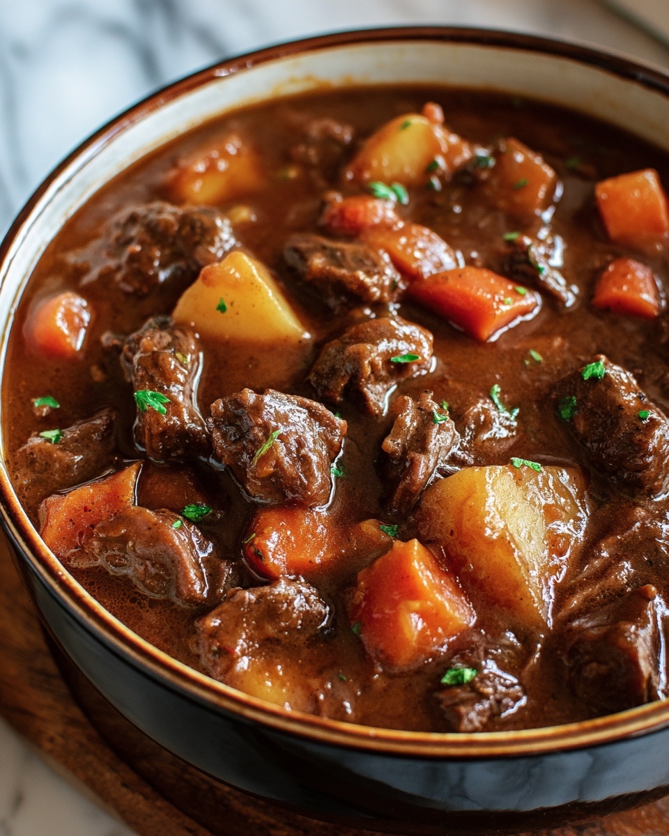 8. Simmer gently: Bring the mixture to a simmer, then cover the pot and reduce the heat to low. Let it cook gently for 2 to 2½ hours until the beef is tender and the flavors meld beautifully.