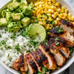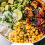 Divide the cooked fluffy rice into four bowls as the base. Add generous slices or diced pieces of the marinated chicken on top. Spoon an ample helping of the avocado corn salsa, and sprinkle crumbled queso fresco or cotija cheese over everything. Garnish with extra cilantro and lime wedges to add freshness and a zesty kick at the table. You’ve just created a stunning, vibrant dish that’s as pleasing to the eye as it is to the taste buds!