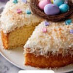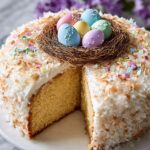 The shredded coconut gives a delicate crunch and snowy appearance, but for a fresh twist, add zest or thin lemon slices atop the frosting. The colorful chocolate eggs are both decorative and a delightful surprise for guests as they cut into the cake.