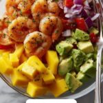 - Combine Salad Ingredients: In a large bowl, mix together the cooked shrimp, diced mango, diced avocado, finely chopped red onion, halved cherry tomatoes, and chopped fresh cilantro until evenly distributed.