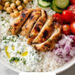 Here’s the fun part: layering all your components! Divide the cooked rice into four bowls. Top with sliced chicken breasts, chickpeas, chopped cucumber, grape tomatoes, and red onion. Add dollops of hummus and tzatziki, and sprinkle crumbled feta on top. For an extra tangy kick, drizzle a little more Greek dressing if you like. Each element adds vibrant color and contrasting flavors that make this Mediterranean Chicken & Rice Bowls Recipe so special.