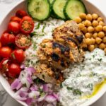 Here’s the fun part: layering all your components! Divide the cooked rice into four bowls. Top with sliced chicken breasts, chickpeas, chopped cucumber, grape tomatoes, and red onion. Add dollops of hummus and tzatziki, and sprinkle crumbled feta on top. For an extra tangy kick, drizzle a little more Greek dressing if you like. Each element adds vibrant color and contrasting flavors that make this Mediterranean Chicken & Rice Bowls Recipe so special.