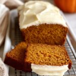 You can freeze the pumpkin bread without frosting. Wrap the cooled loaf tightly in plastic wrap and foil before freezing for up to 3 months. When ready to enjoy, thaw overnight in the fridge and then add freshly made cream cheese frosting to keep that classic flavor intact.