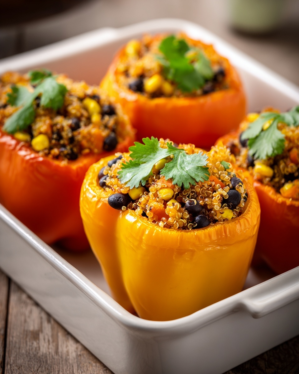Remove from the oven and serve your Quinoa Stuffed Bell Peppers hot. The aromatic spices and melty cheese create an inviting meal that tastes both nourishing and indulgent.