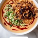 Finishing touches like sliced green onions and a sprinkle of sesame seeds add a delightful contrast in both taste and texture. The bright green onion adds a fresh pop, while sesame seeds give a subtle crunch and nutty flavor that enhances the soup’s complexity beautifully.