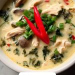 A fragrant and flavorful Thai Coconut Chicken Soup featuring tender chicken thighs simmered in a creamy coconut milk broth infused with lemongrass, ginger, garlic, and Thai red chilies. This comforting soup is balanced with fresh lime juice, fish sauce, and a touch of sweetness, garnished with cilantro and green onions for a vibrant finish.