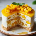 A luscious and refreshing Unbaked Cheese and Mango Cake that combines a buttery biscuit crust with a creamy mango-infused cheesecake filling, topped with a delicate mango gelatin glaze and fresh mango slices. This no-bake dessert is perfect for warm weather and requires minimal oven use, offering a smooth, fruity, and creamy treat that is sure to impress.